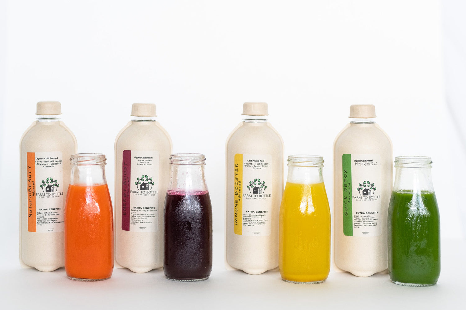 Our Juices are made with 100% fruits and vegetables nothing else, bottled in glass with the purpose to keep microplastics out of your body and our environment.