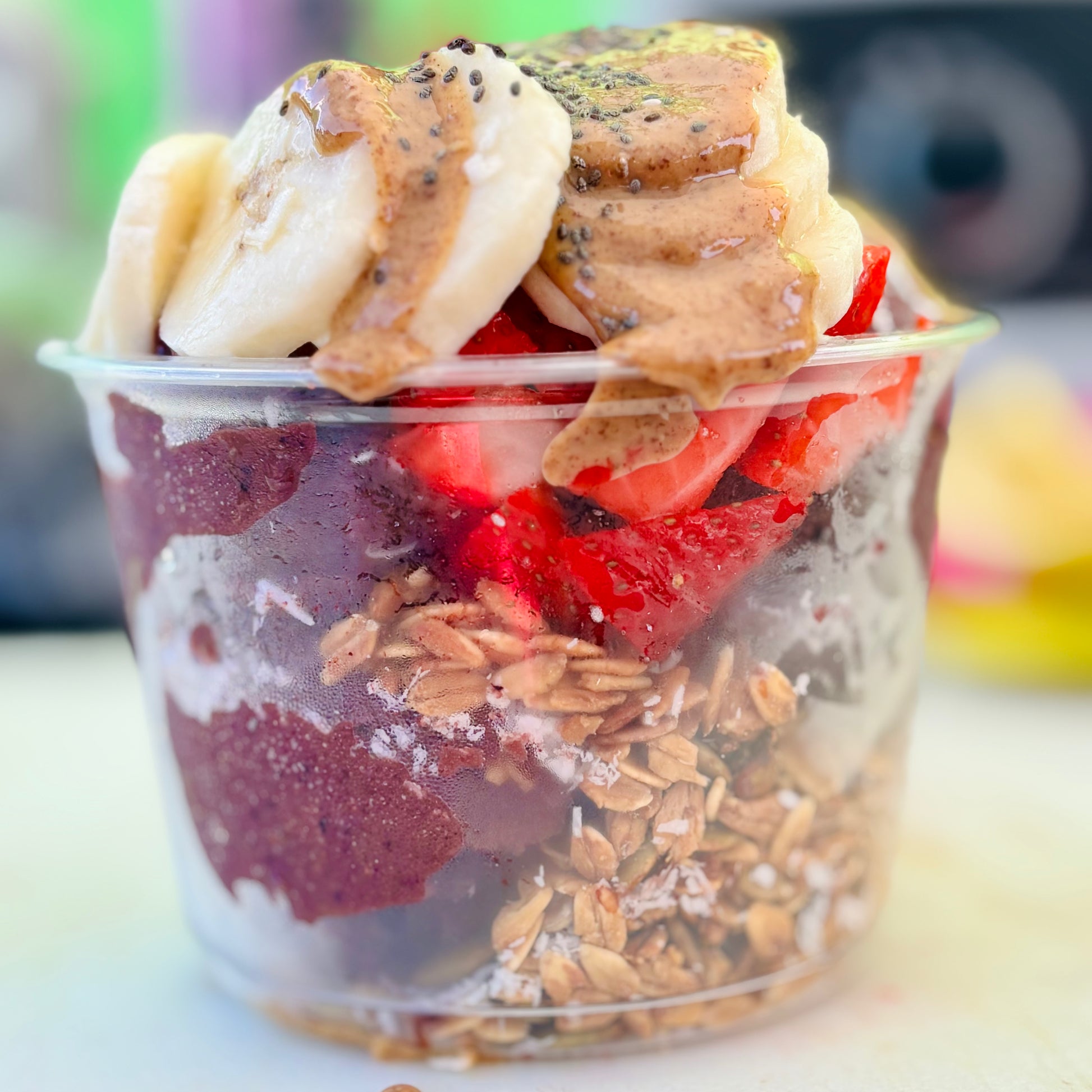 organic banana, organic açai, organic strawberry, organic blueberries base, topped with. organic banana, strawberries, in-house-made GF vanilla granola, organic shredded coconut, organic chia seeds, almond butter drizzled.