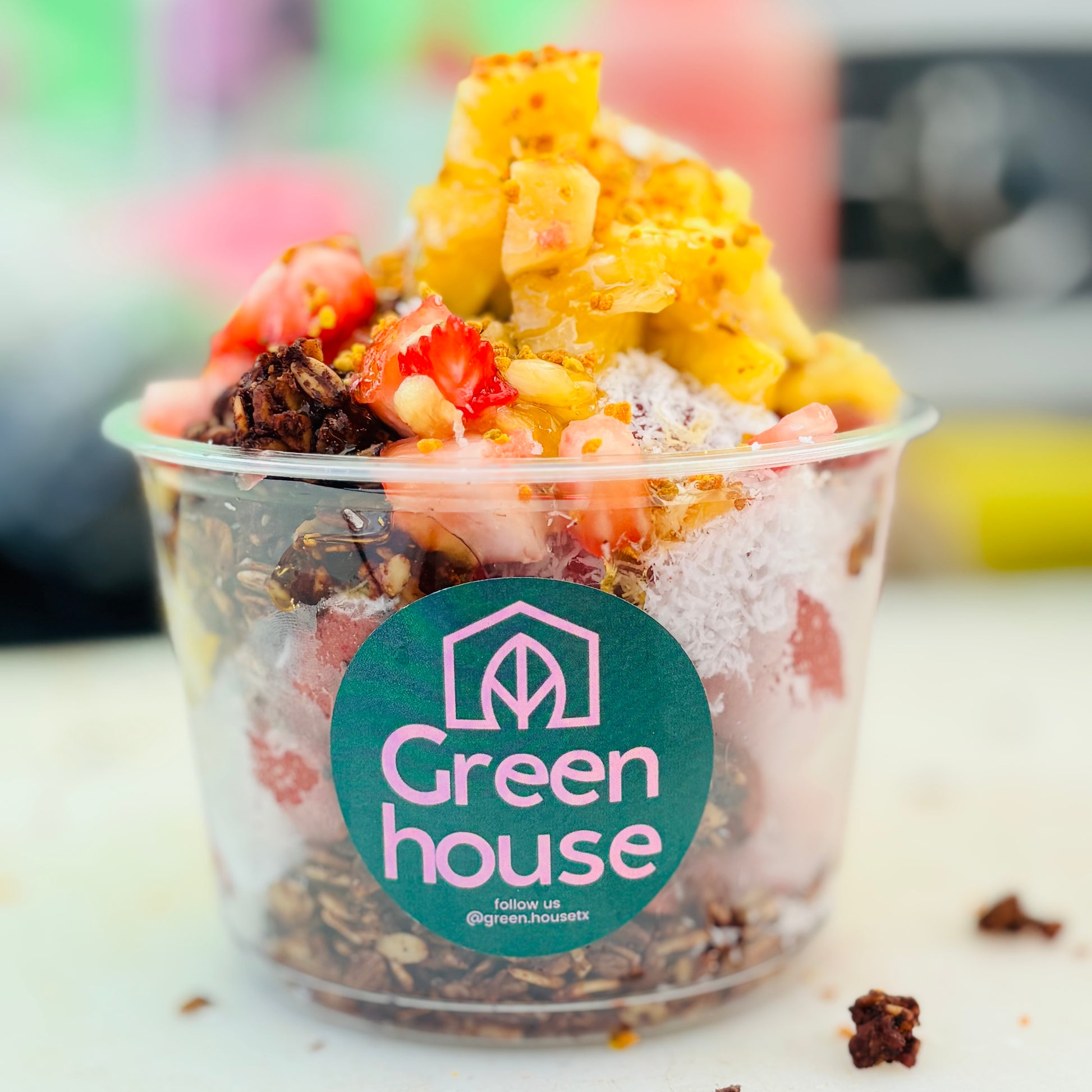 organic banana, organic mango, organic dragon fruit base, topped with in-house-made organic cocoa GF granola, organic shredded coconut, pineapple, strawberries, organic bee pollen, vanilla infused local honey drizzle